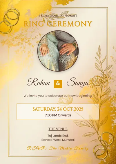 Before the Wedding (Shaadi), comes the Engagement. It's the first official announcement of your union. PosterPro offers specific designs for every Indian engagement tradition, be it a Roka, Sagai, or Ring Ceremony.